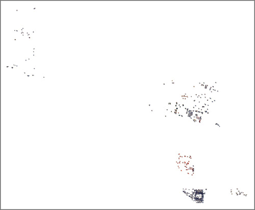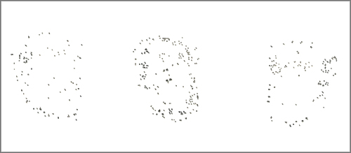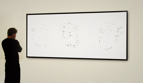 All the People on Google Earth is an ongoing series of modified snapshots of crowds I find on Google Earth, where everything but the people (and their attendant blankets, umbrellas, dogs, etc.) has been removed. Given the current limitations of resolution on Google Earth, I can only use imagery from the handful of places where angled imagery is available at the most zoomed-in level. The angle reveals each person's shadow, which is often the only thing that identifies a particular shape as a person at all. Occasionally we may see a leg thrust out in the act of walking; there are suggestions of tennis-playing movements. Otherwise the people exist on the very limit of the recognizable, dissolved into pixels.